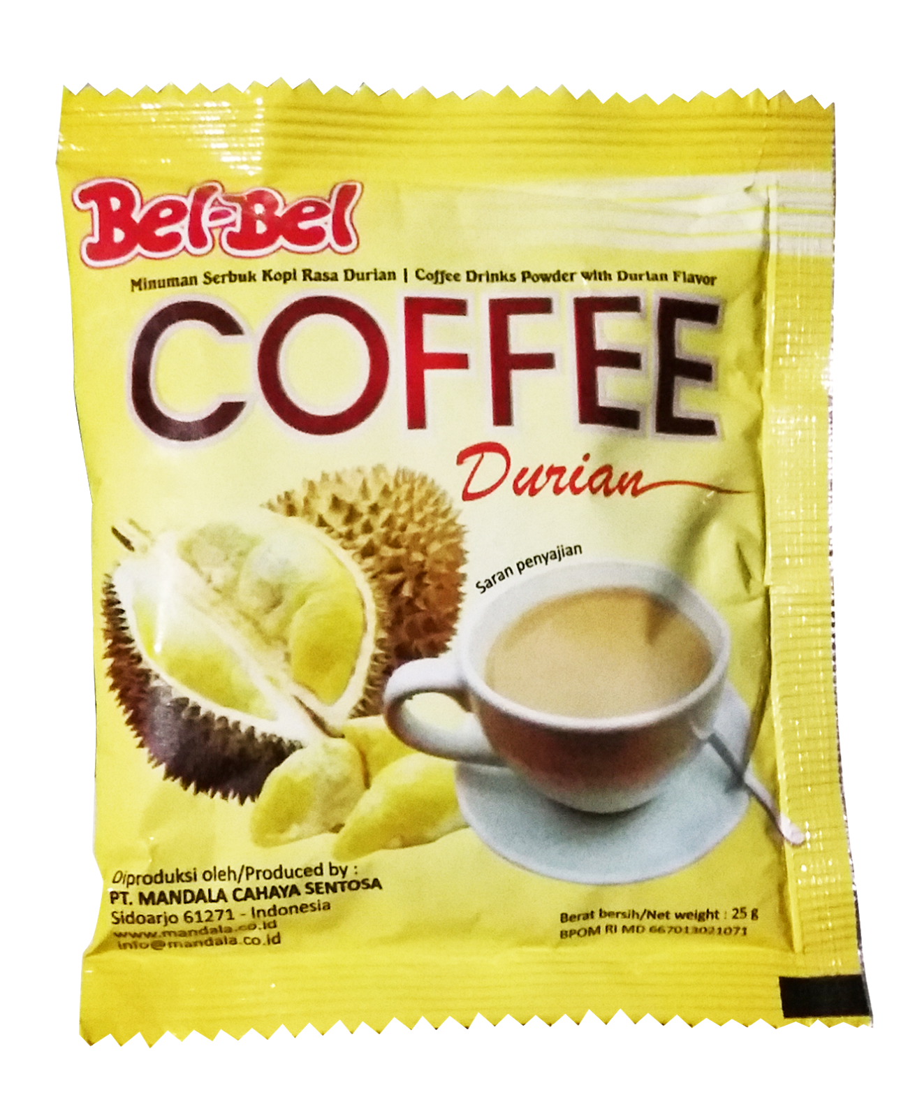 Salah satu Produk PT.Mandala Cahaya Sentosa yang di cetak dan sebarkan dengan merek BEL-BEL merupakan minuman instan kopi dengan rasa durian yang khas , campuran antara kopi dan buah durian yang di racik dengan formula dari perusahaaan kami membuat minuman ini sangat nikmat untuk dinikmati di saat kapanpun , siap di sajikan dalam panas ataupun dingin . cukup hanya 5 menit penyajian .